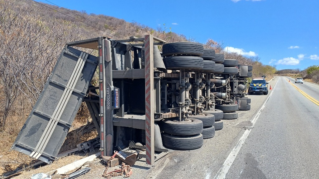 Santa Luzia (PB) – 11/08/2025 – Uma carreta carregada com 34 toneladas de rocha ornamental tombou no início da tarde desta segunda-feira (11) na Serra de Santa Luzia, no Km 281 da BR-230. O acidente aconteceu por volta das 12h15 e mobilizou equipes da Polícia Rodoviária Federal (PRF).