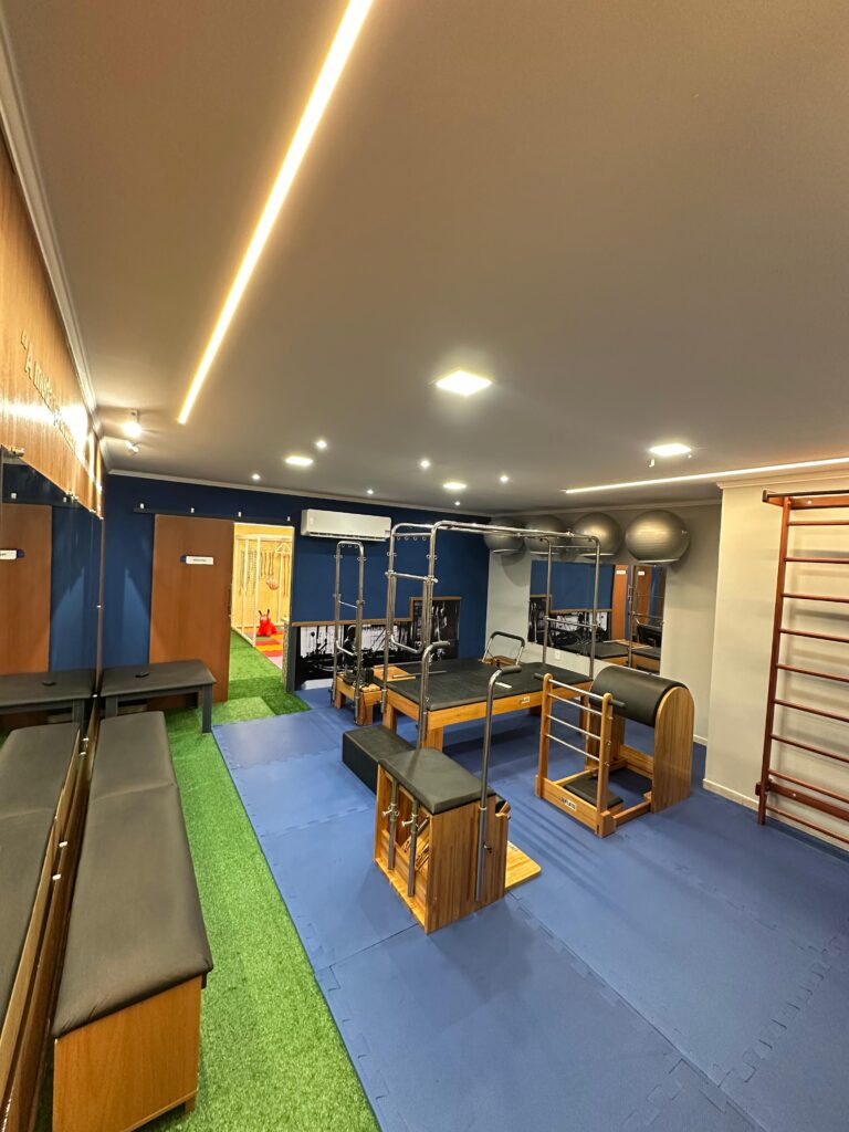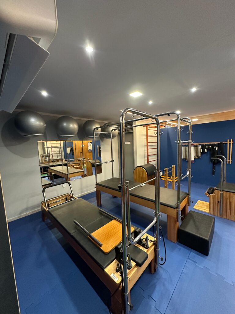 - Estúdio de Pilates completo, equipado com aparelhos como Reformer, Cadillac, Barrel e Chair, além de acessórios para exercícios personalizados.
