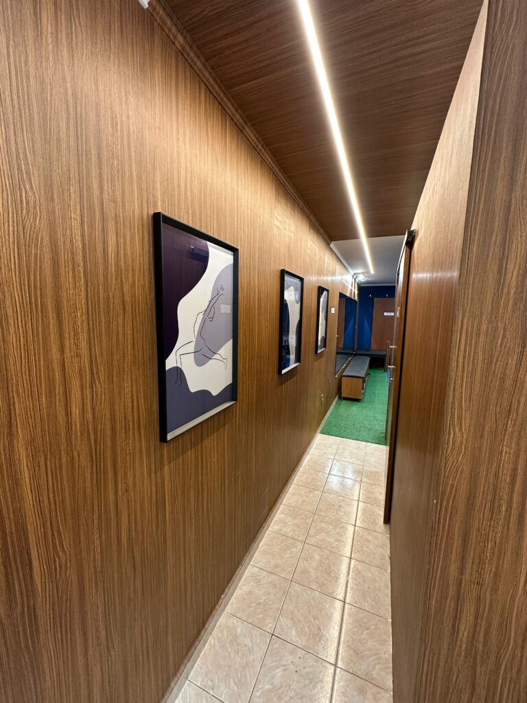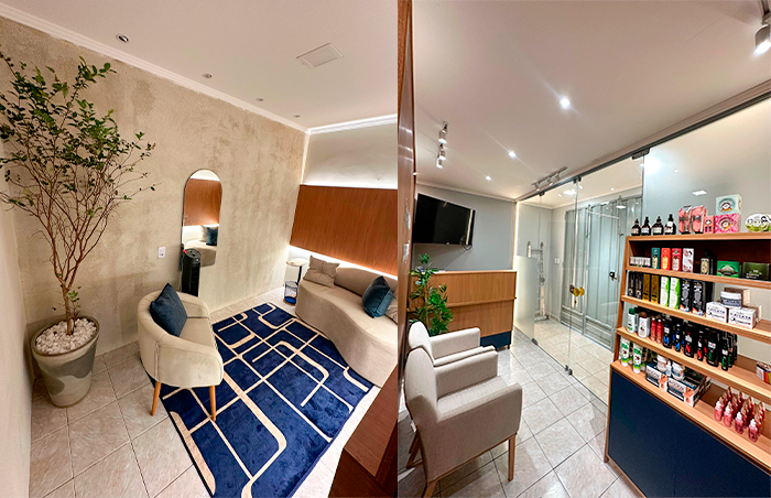 A recepção moderna e aconchegante dá o tom do atendimento, transmitindo confiança e tranquilidade. Além de um espaço de espera confortável, a clínica disponibiliza uma área de exposição de produtos voltados para saúde e qualidade de vida.