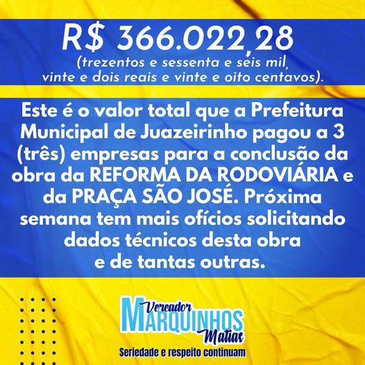 “Você sabia? , Detalhe para o valor inicial do contrato homologado, com cerca de R$ 206mil. Mais uma vez, obrigado Sagres pelas informações, comentou o vereador em sua rede social sobre a verba para reforma da Rodoviária e da praça São José.