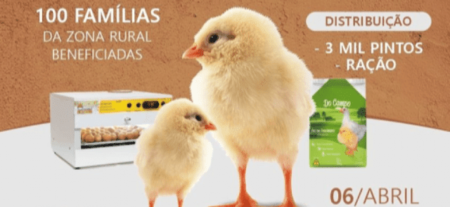 “Iremos iniciar a primeira etapa do Projeto Granjinha, com a distribuição de 3 mil pintos e ração, beneficiando 100 famílias cadastradas da zona rural. Iremos estimular a criação e gerar renda, com chocadeiras teremos produção própria e vamos ampliar o projeto para quem mais precisa”, disse o prefeito Dr. Umberto Jefferson.