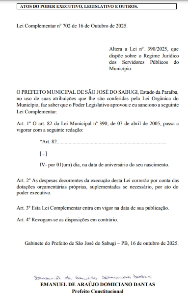 Em uma recente conquista para os servidores públicos de São José do Sabugi, foi sancionada a Lei Complementar nº 702, publicada no dia 16 de outubro de 2025. A nova legislação modifica o Art. 82 da Lei Municipal nº 390, de 7 de abril de 2005, garantindo aos servidores municipais o direito a um dia de folga no dia do seu aniversário.