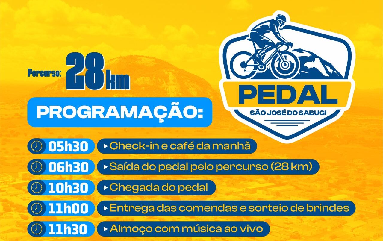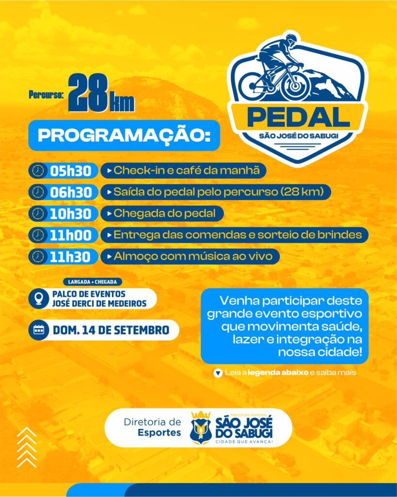 São José do Sabugi (PB) – O aguardado Pedal São José do Sabugi 2025 será realizado neste domingo, dia 14 de setembro, reunindo ciclistas e amantes do esporte para um dia de lazer, integração e qualidade de vida. O evento acontecerá no Palco de Eventos José Derci de Medeiros e promete movimentar a cidade com uma programação especial.