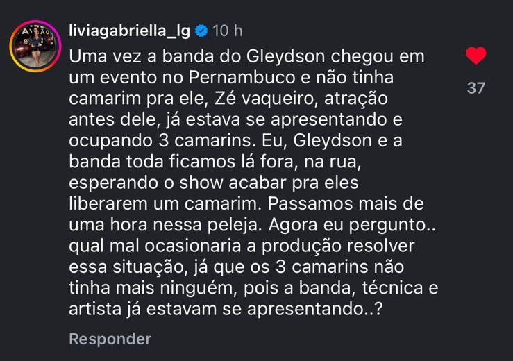 Um dos comentários mais repercutidos foi o de Lívia Gabriella, esposa do cantor Glaydson Gavião, que afirmou que, em um show realizado em Pernambuco, a equipe de Zé Vaqueiro teria ocupado os três camarins disponíveis, mesmo com o cantor já se apresentando no palco. Segundo ela, a equipe de Glaydson Gavião ficou mais de uma hora aguardando na rua, sem qualquer suporte.
