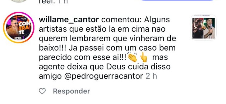 Outro depoimento que chamou atenção foi o do cantor Willame Cantor, que afirmou ter vivido situação muito semelhante à relatada por Pedro Guerra, também envolvendo a equipe do artista.