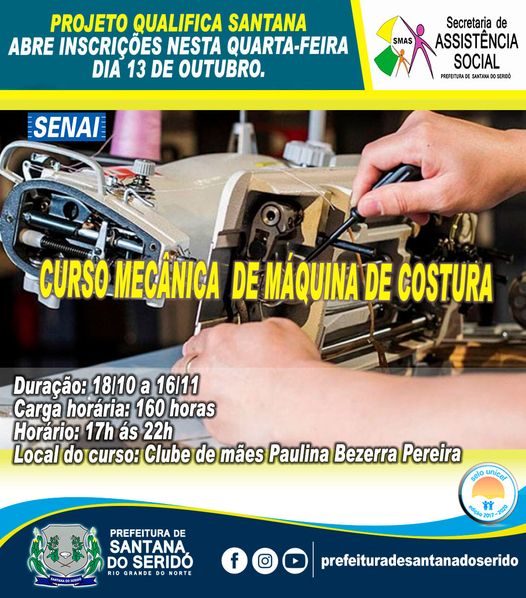 A Prefeitura de Santana do Seridó através da Secretaria Municipal de Assistência Social, informa que às inscrições para o Curso de Mecânica de Máquina de Costura com carga horária de 160 horas, estão abertas.