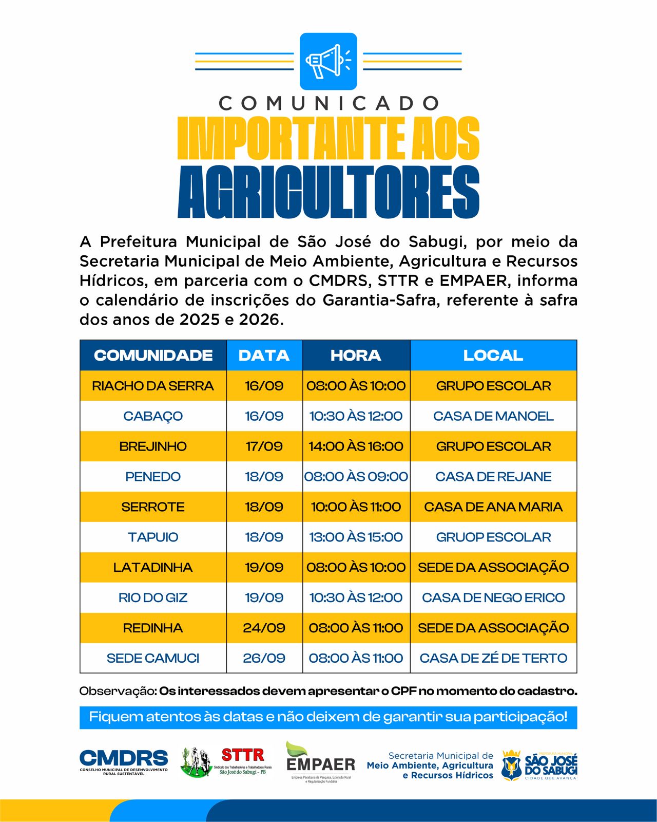 A Prefeitura de São José do Sabugi irá realizar, entre os dias 18 e 26 de setembro, as inscrições do Garantia-Safra, referente à Safra dos anos de 2025 e 2026. Os interessados devem apresentar o CPF no momento do cadastro.