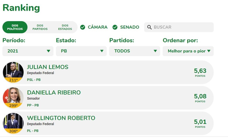 Nesta classificação, o 1º parlamentar mais bem avaliado, de acordo com o Ranking é o Deputado Federal, Juliam Lemos (PSL) com 5,63 pontos, seguida da senadora Daniela Ribeiro com 5,08 pontos, e Deputado Federal, Wellington Roberto com 5,01 pontos.