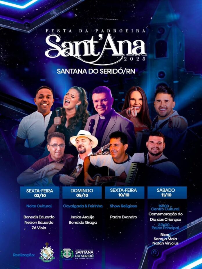 Santana do Seridó (RN) – A cidade se prepara para viver momentos de fé, tradição e muita cultura com a realização da Festa da Padroeira Sant’Ana 2025. O evento, que é uma das celebrações mais aguardadas da região, acontece entre os dias 3 e 11 de outubro, reunindo apresentações culturais, atividades religiosas e grandes shows no palco principal.