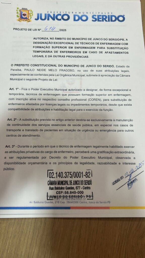 JUNCO DO SERIDÓ, PB – Uma manobra da oposição na Câmara Municipal de Junco do Seridó impediu a aprovação de um projeto de lei controverso, de autoria do prefeito Paulo. O Projeto de Lei nº 614/2025, que permitiria que técnicos de enfermagem substituíssem enfermeiros em casos de afastamento, foi barrado pelos vereadores Saulo Medeiros e Tiago de Fátima. A surpresa veio do fato de a proposta ter sido apresentada pelo próprio prefeito, que é médico, um profissional da área de saúde.